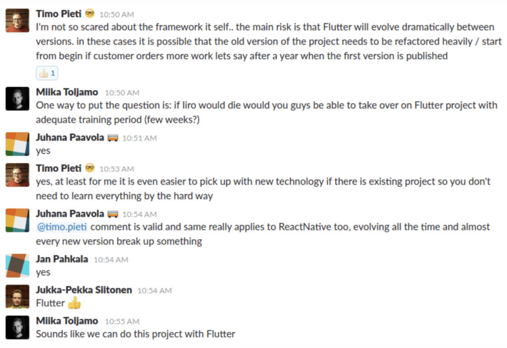Iiro started to fall deeper into the siren songs of Flutter, and he managed to convince me and the rest of Codemate’s management team to invest time and resources in an effort to learn more about Flutter. The way he convinced us tells a lot about our culture: he had to pitch the new technology to his colleagues and get a green light from them. For that, we gave Iiro a few months to get familiar with the emerging technology.
