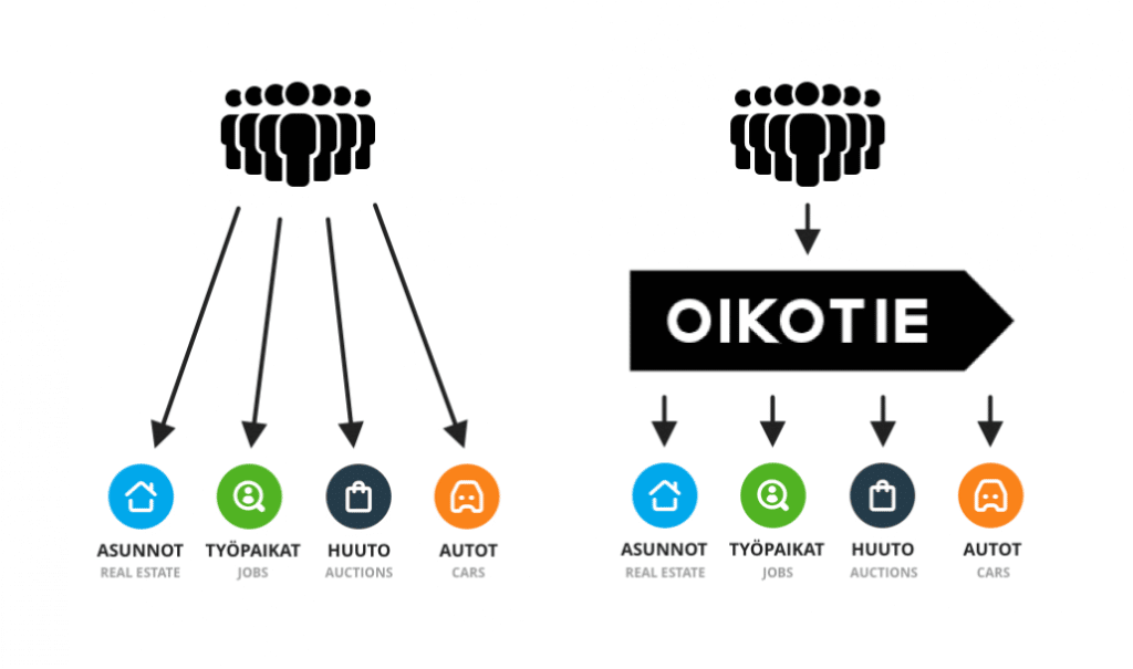 Figure 1: The new Oikotie service shows users content from the verticals, such as apartments and jobs from Oikotie Asunnot and Oikotie Työpaikat, and featured blog content.