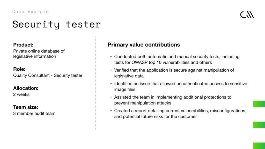 Security risks are an important consideration when developing a project. To mitigate these risks, it is essential to make informed decisions about architecture, coding languages, tools, and coding practices from the beginning of the project. Despite our best efforts, however, it is possible that new information or changes may reveal previously unforeseen security risks. In these cases, it may be necessary to conduct a more thorough analysis of the risk, even if the likelihood of it occurring is low. Our security risk specialists can assist with structured penetration testing sessions using professional tools to identify and address any potential vulnerabilities.