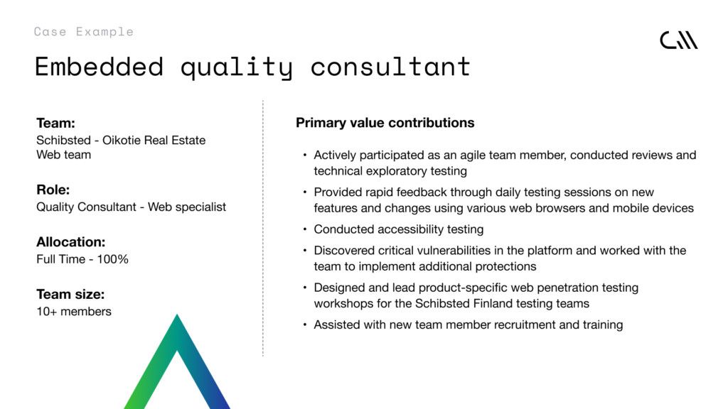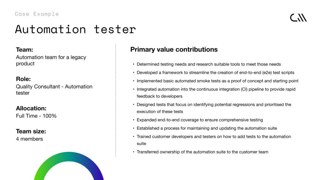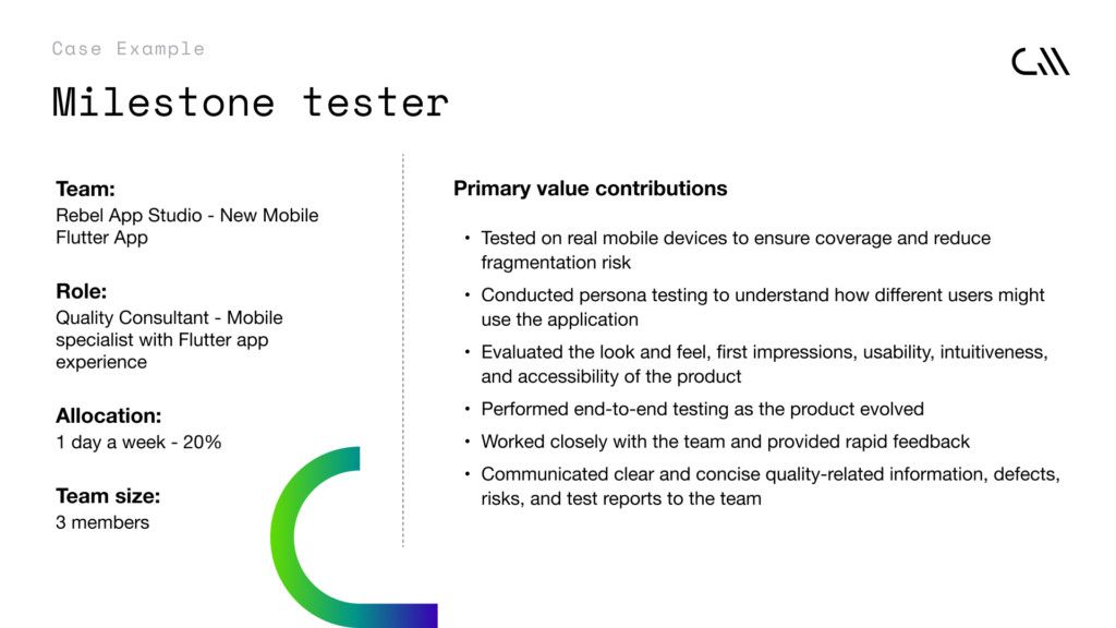 To ensure the quality of our projects, we often assign one of our quality specialists to work closely with the development team. These specialists have expertise in web and mobile application testing and play a crucial role in continuously testing risks at the feature and system levels. They also contribute to the full lifecycle of quality in our projects. The specific allocation of a quality specialist may vary depending on the needs of the project.