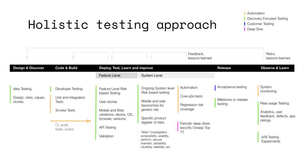 This model highlights the importance of team-based testing, where everyone is involved and its many applications throughout a product’s cycle to keep your quality goals on track and provide rapid feedback loops to the team. After all, each member of the multidisciplinary team spots and acts on different things. With this holistic view we will cover all aspects of quality in our daily work.